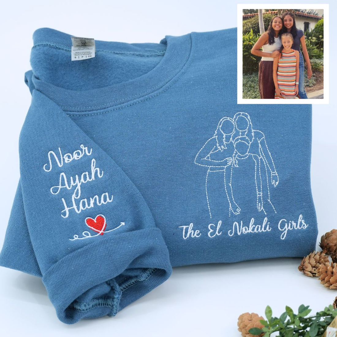 Celebrate your special bond with a custom embroidered sweatshirt showcasing a personalized sister full-color portrait....